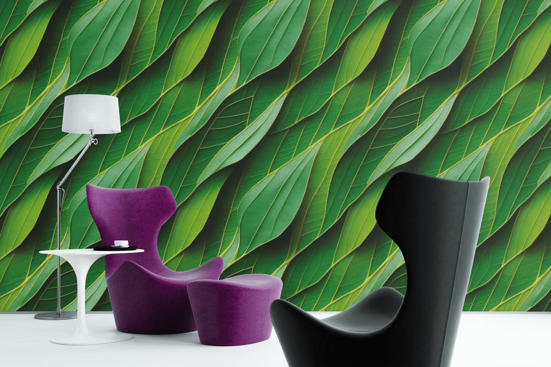 Renovar tus paredes con nuestros vinilos es una elección versátil y sencilla. Un patrón de hojas verdes superpuestas que crea un efecto 3D realista. Ideal para decoración moderna y fresca en cualquier estancia.