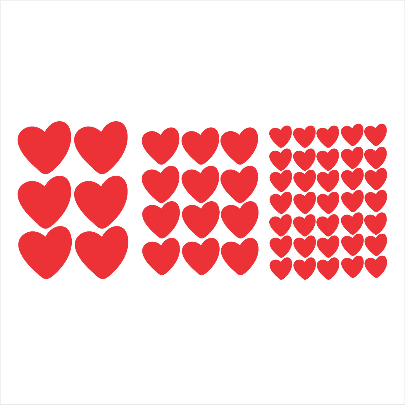 6 corazones de 6,5 cm, 12 corazones de 4,5 cm y 35 corazones de 3 cm. Total 53 unidades.
