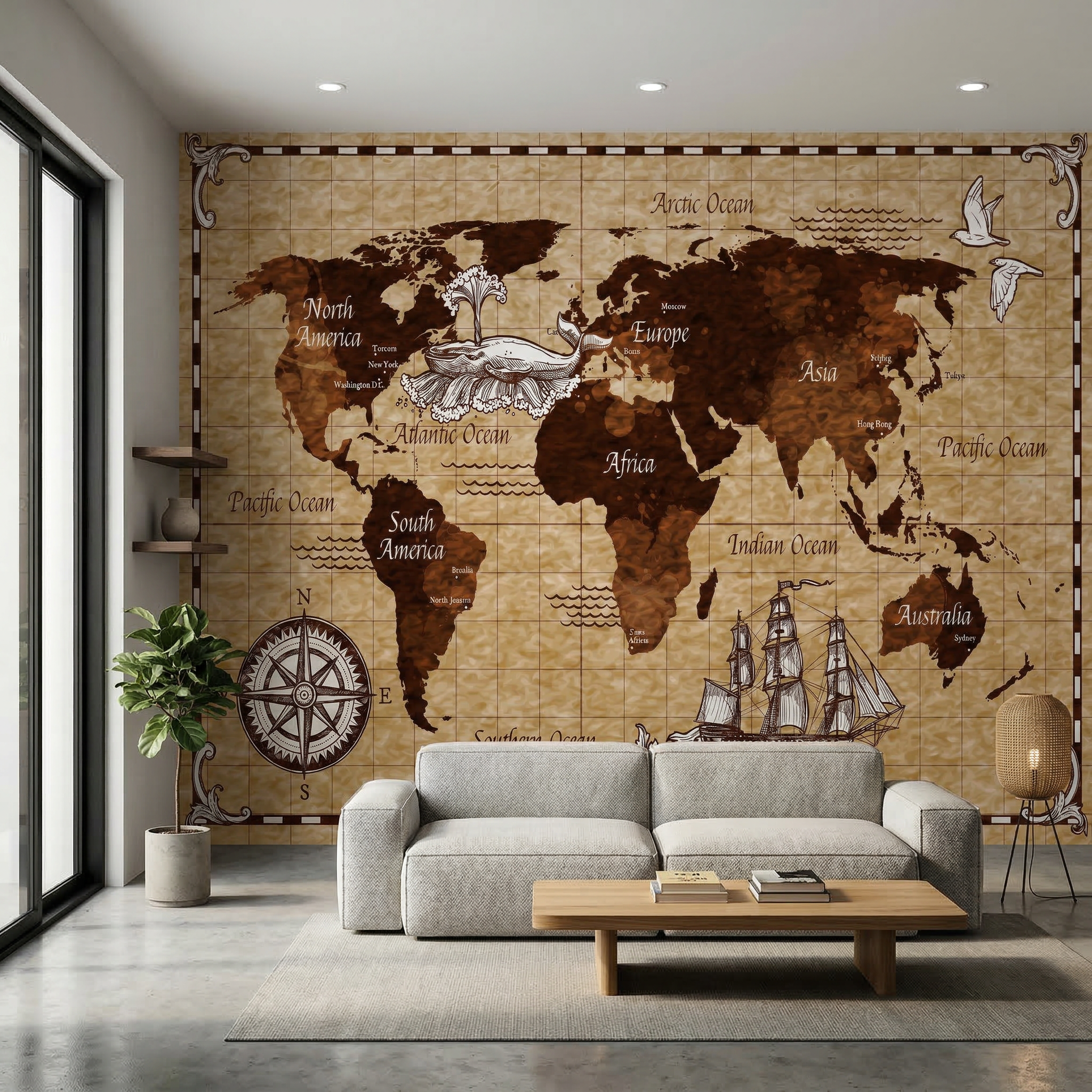 Este vinilo mural de mapa mundial en tono sepia combina elegancia y estilo clásico en un diseño detallado con referencias cartográficas tradicionales. Ideal para espacios amplios, oficinas o ambientes con estética sofisticada. Sus tonos cálidos y su estilo antiguo generan una sensación acogedora y atemporal. Perfecto para crear un ambiente distinguido con inspiración histórica.