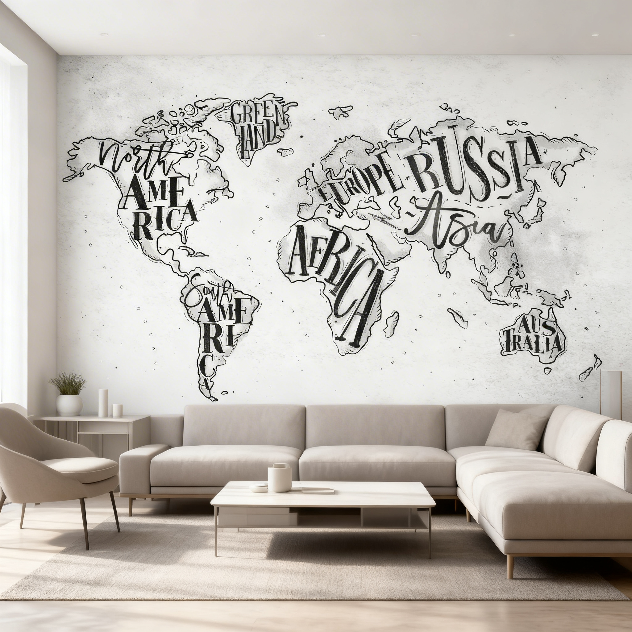 Transformá tus espacios con este vinilo mural de mapa mundial en estilo tipográfico blanco y negro. Su diseño moderno combina ilustración minimalista con letras artísticas que forman los continentes, ideal para ambientes contemporáneos, oficinas, estudios o habitaciones juveniles. Aporta personalidad, cultura y estilo sin sobrecargar el ambiente.