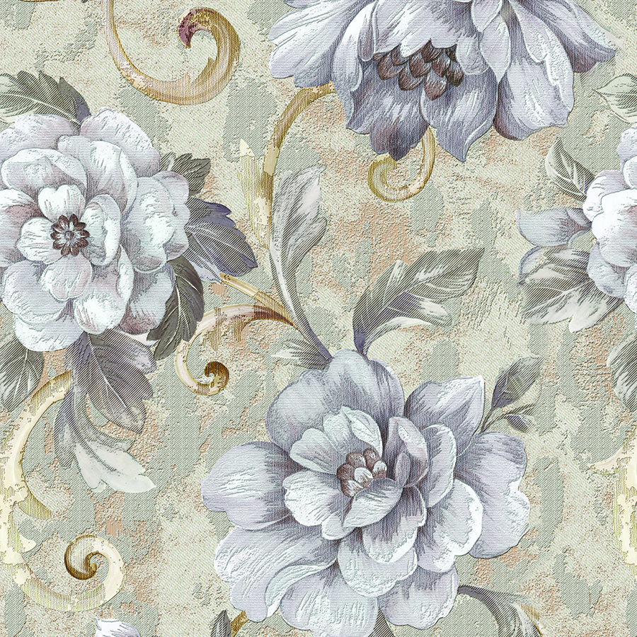 Mural vinílico de estilo clásico con grandes flores gris azuladas y detalles dorados sobre fondo texturizado. Ideal para ambientes elegantes como comedores formales, livings sofisticados, hoteles o recibidores. El diseño recuerda a un tapiz antiguo pero con frescura actual. Se imprime en vinilo autoadhesivo de alta calidad, fácil de instalar y limpiar. Combina muy bien con muebles en madera oscura, tapizados neutros, dorado envejecido y cortinas pesadas en tonos piedra o gris humo.
