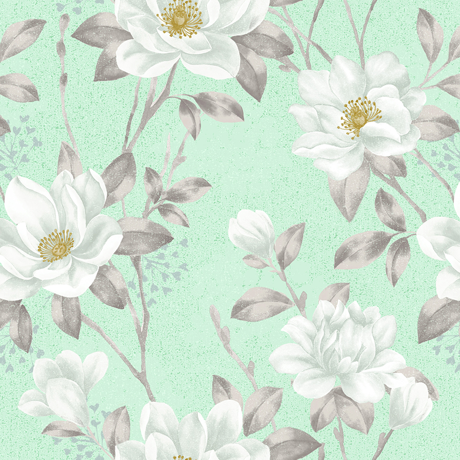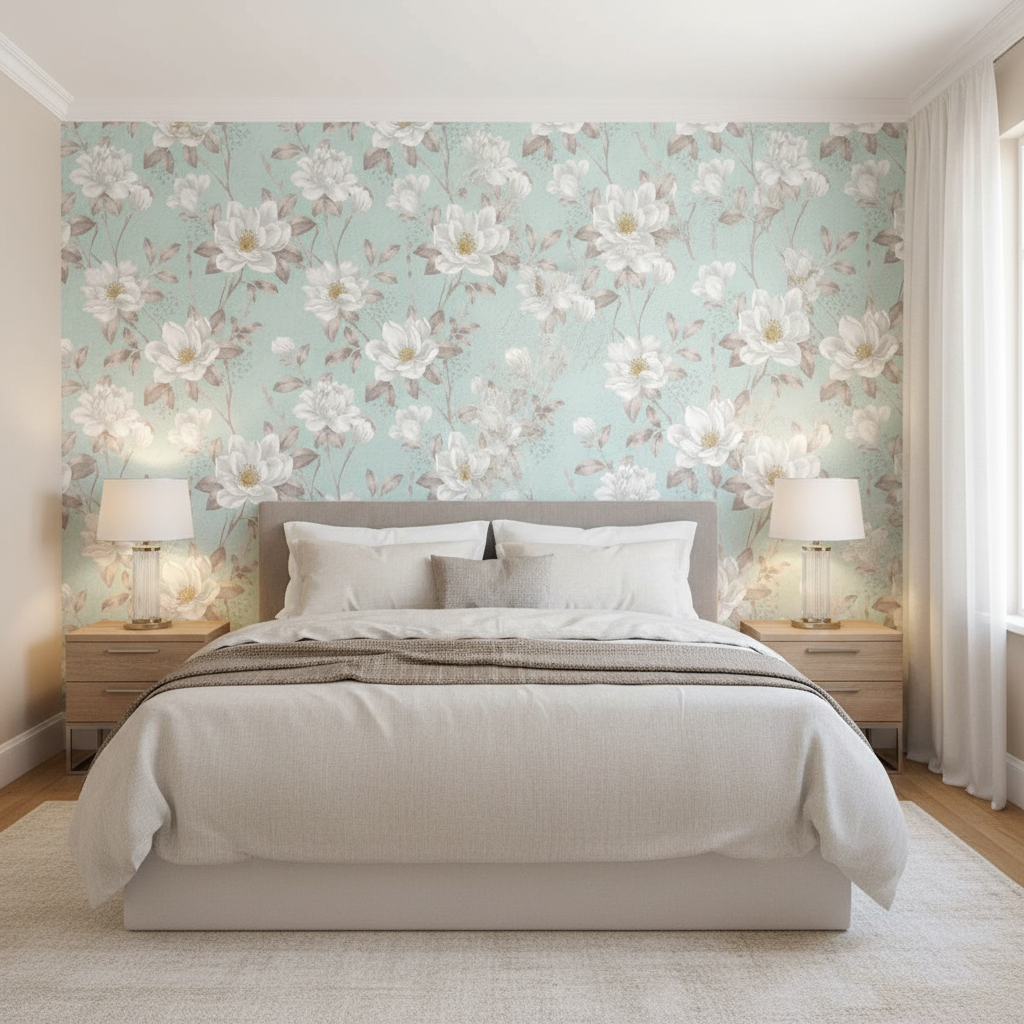 Mural para pared con flores tipo magnolia en blanco suave sobre fondo verde menta, ideal para crear ambientes románticos y luminosos. El diseño combina pétalos suaves con hojas en tonos grisados, logrando un efecto elegante y delicado sin resultar recargado. Impreso en vinilo autoadhesivo de alta calidad, es fácil de colocar y limpiar, perfecto para dormitorios, livings femeninos o estudios de belleza. Combina muy bien con muebles blancos o madera clara y textiles en beige, arena o rosa pastel.