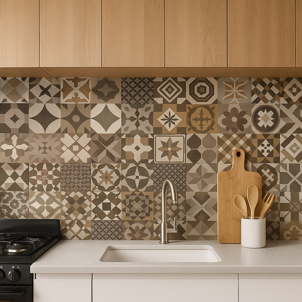 Inspirado en los mosaicos clásicos, este diseño en tonos tierra aporta calidez y un aire tradicional. Perfecto para cocinas rústicas o baños con un estilo acogedor y natural.