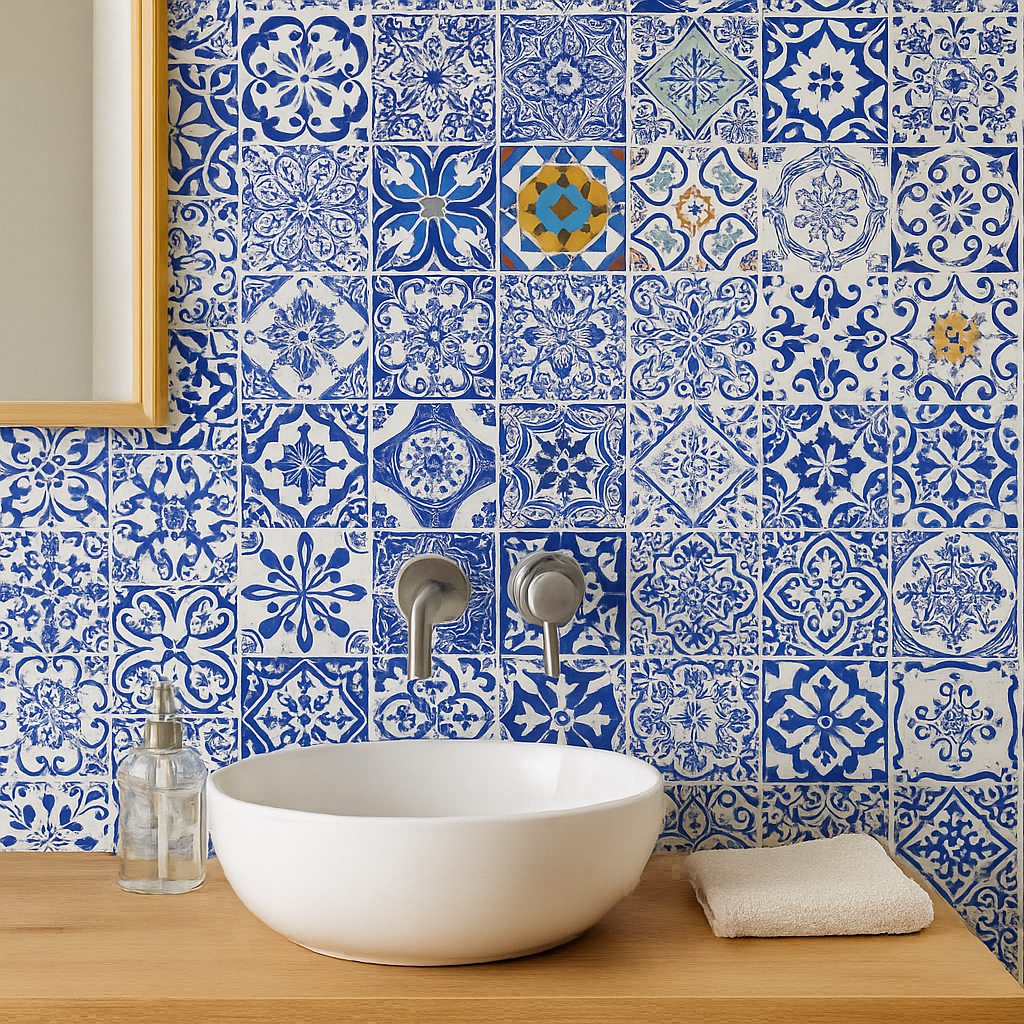 Patrón sofisticado con toques dorados sobre fondo azul, que aporta lujo y elegancia. Perfecto para un baño distinguido o una cocina elegante con aire clásico.