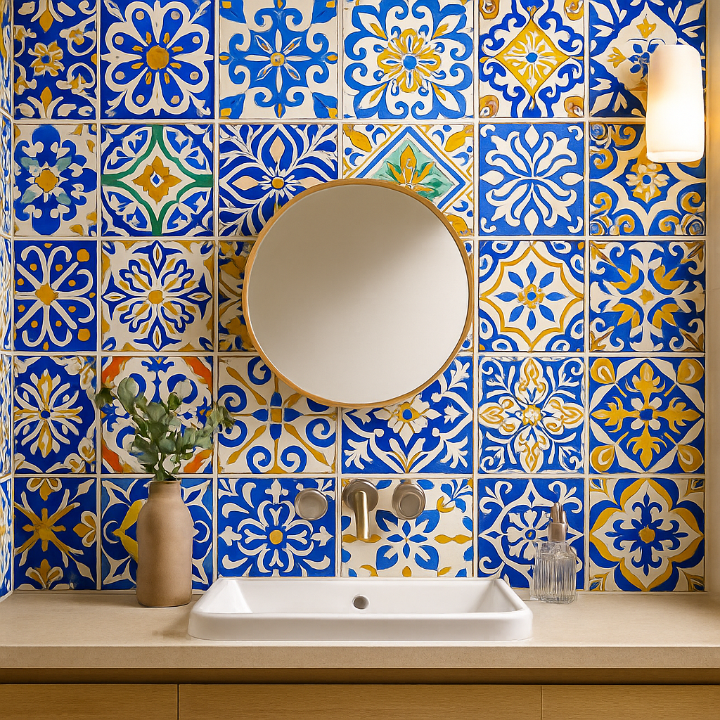 Este patrón clásico con arabescos azules y blancos evoca el encanto de los tradicionales azulejos portugueses. Perfecto para cocinas elegantes o baños con un aire sofisticado.
