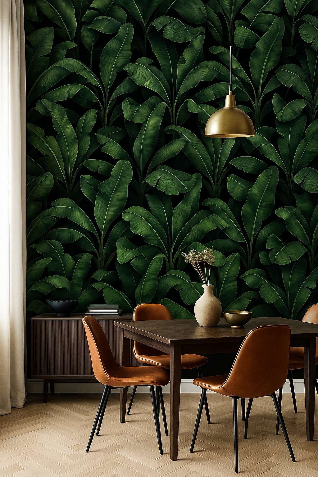 Recomendaciones de decoración: Perfecto para paredes de acento en salones modernos, restaurantes temáticos o dormitorios contemporáneos. El contraste entre el verde vibrante de las hojas y el fondo negro genera un efecto visual impactante, ideal para crear profundidad en espacios amplios. Combina muy bien con mobiliario de líneas limpias, detalles en dorado, negro mate, mármol o madera oscura. Agrega iluminación puntual para realzar la textura y el color del vinilo.