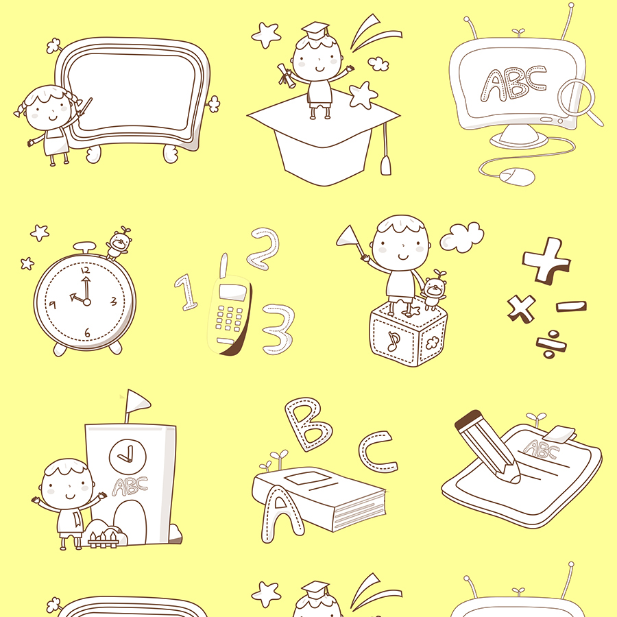 Este vinilo infantil educativo presenta divertidas ilustraciones escolares en tono marrón sobre un fondo amarillo brillante. Incluye dibujos de niños, letras, números, relojes, calculadoras y elementos de aprendizaje que fomentan la creatividad y el interés por el conocimiento. Fabricado en vinilo de alta calidad, es fácil de instalar, lavable y resistente, perfecto para decorar habitaciones infantiles, guarderías o espacios de estudio, creando un entorno alegre y estimulante.