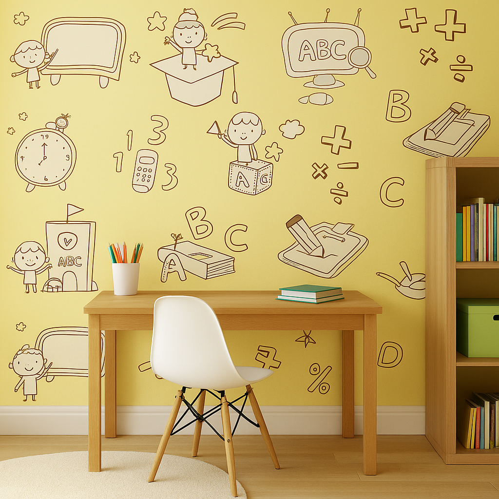Ideal para paredes de salas de estudio infantil o rincones educativos. Combina con mobiliario de madera clara o blanco, alfombras suaves y estanterías coloridas para guardar libros y material didáctico. La tonalidad amarilla ilumina el espacio, aportando energía y motivación para aprender.