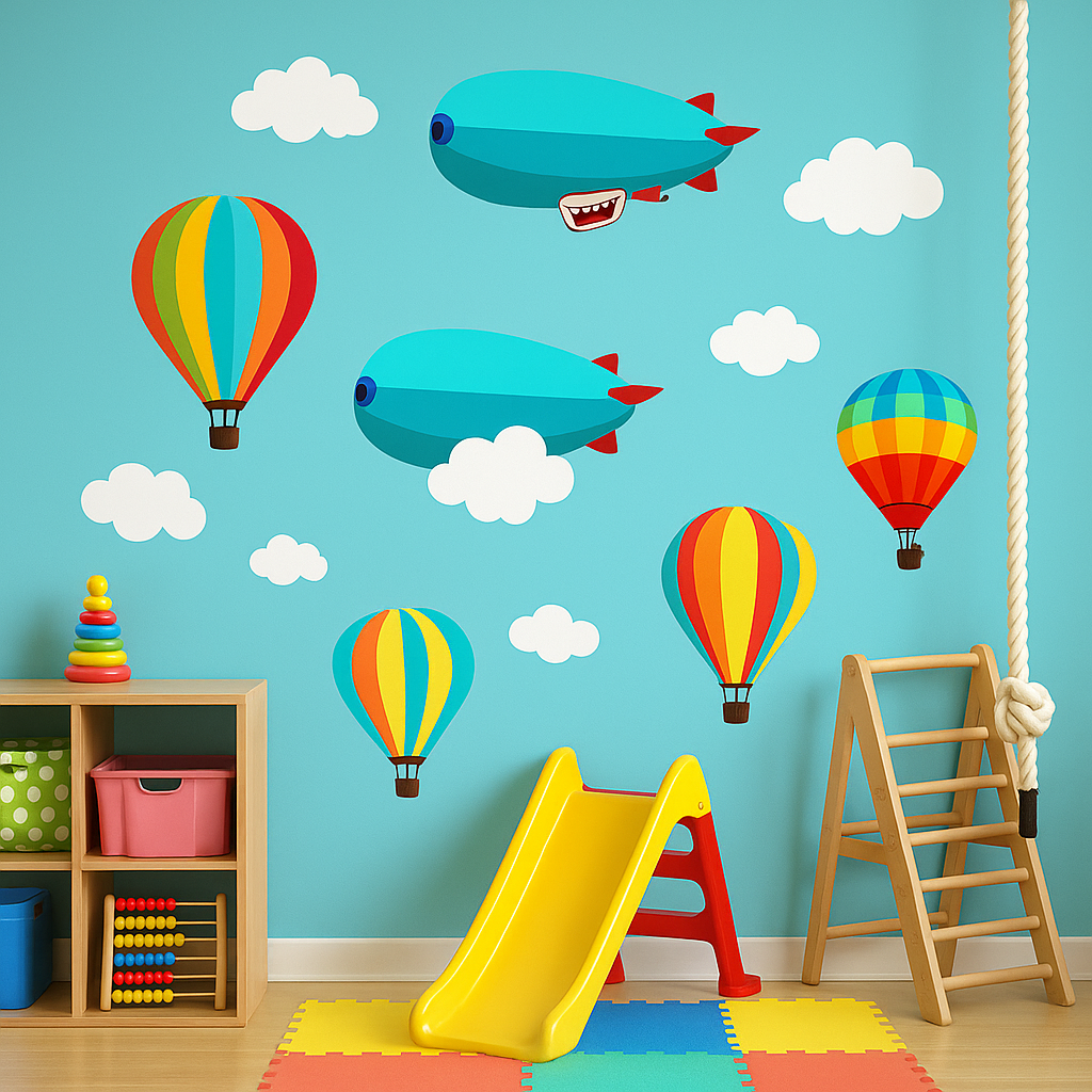 Este vibrante vinilo infantil presenta globos aerostáticos y dirigibles en colores vivos como rojo, amarillo, azul y naranja, acompañados de nubes blancas sobre un fondo celeste. Su diseño alegre y dinámico es perfecto para estimular la imaginación y aportar energía a cualquier espacio infantil. Fabricado en vinilo de alta calidad, es fácil de instalar, resistente y lavable, ideal para salas de juegos, guarderías o rincones creativos.