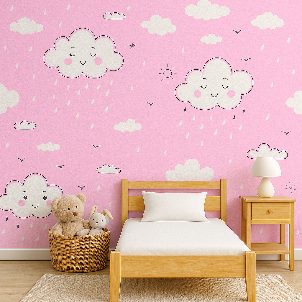 Este tierno vinilo infantil muestra nubes sonrientes con gotas de lluvia, pequeños pájaros y detalles sutiles que evocan calma y alegría. El fondo rosa pastel aporta calidez y dulzura, ideal para habitaciones de bebés y niños pequeños. Fabricado en vinilo de alta calidad, es resistente, fácil de limpiar y de instalar, transformando cualquier pared en un espacio acogedor y lleno de encanto. Perfecto para crear un ambiente relajante y estimulante a la vez.