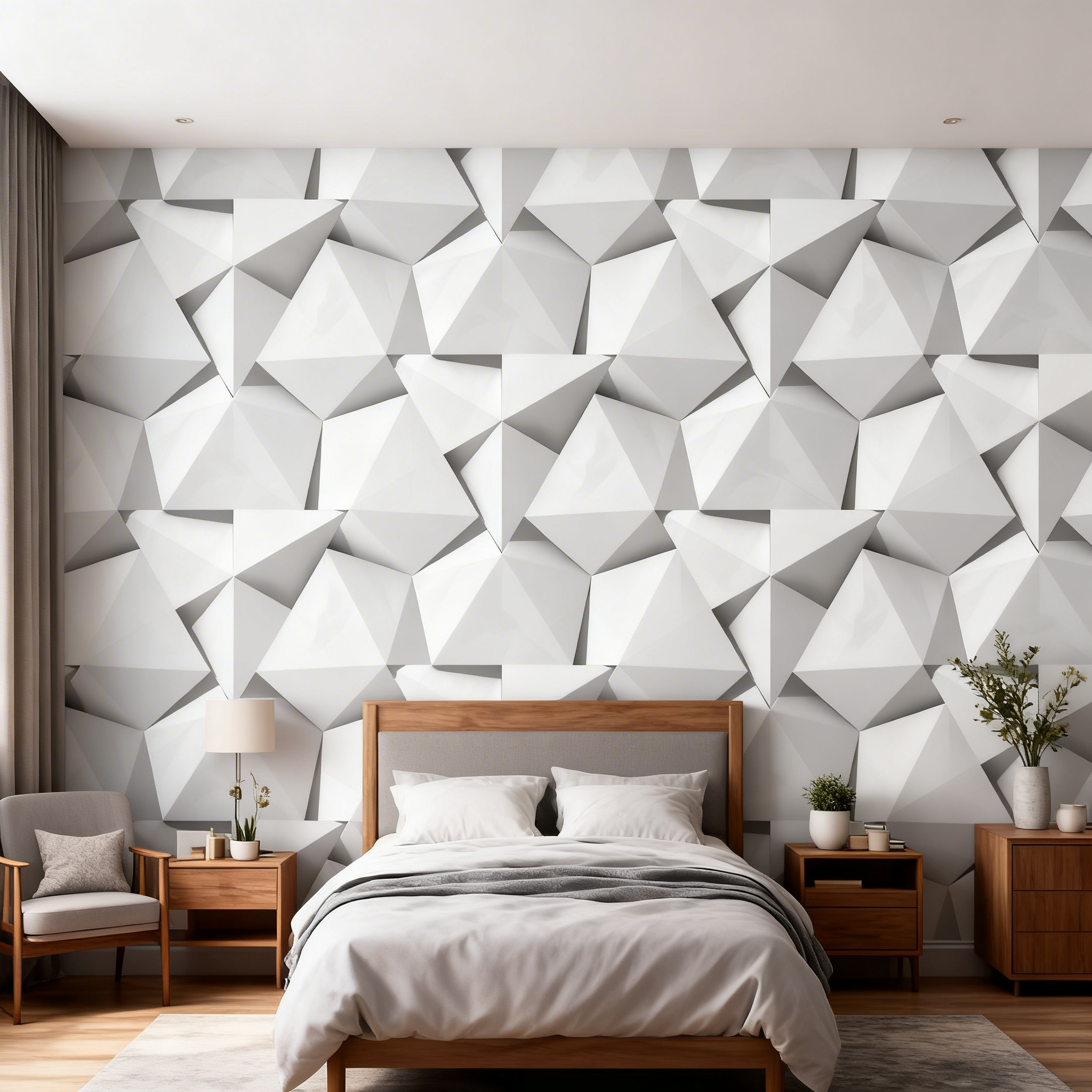 Un diseño impactante y moderno. Este mural de triángulos en efecto 3D crea una pared dinámica y arquitectónica, ideal para espacios contemporáneos.